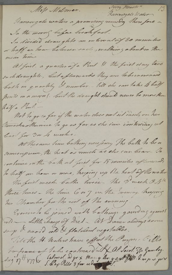 | Summary | Reply for 'Miss Milmer'. Advice for her taking Harrogate waters, bathing, diet and exercise, for menstrual problems. Includes recipe for purgative pills. Subsequent Letter ID: 3920 makes it clear that she is actually in Harrogate. |