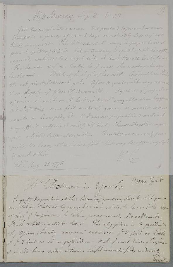 [ID:3910] From: Dr William Cullen (Professor Cullen) / To: Dr Robert Dolman (of York and Pocklington) / Regarding: Dr Robert Dolman (of York and Pocklington) (Patient) / 26 August 1776 / (Outgoing)