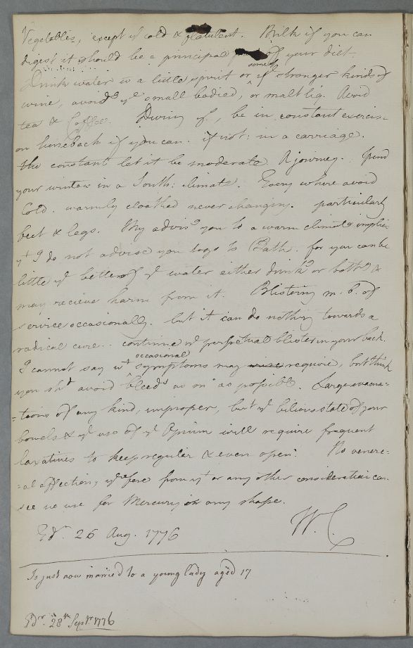 1: Dr Thomas Dolman's first wife had died in 1770 - leaving at least six children - and he had just married Elizabeth Warren of York as his second wife. This is an unusual postscript, apparently added by Cullen out of sheer curiosity value, though he did share a commonly held view that late marriages might prove invigorating for the man.