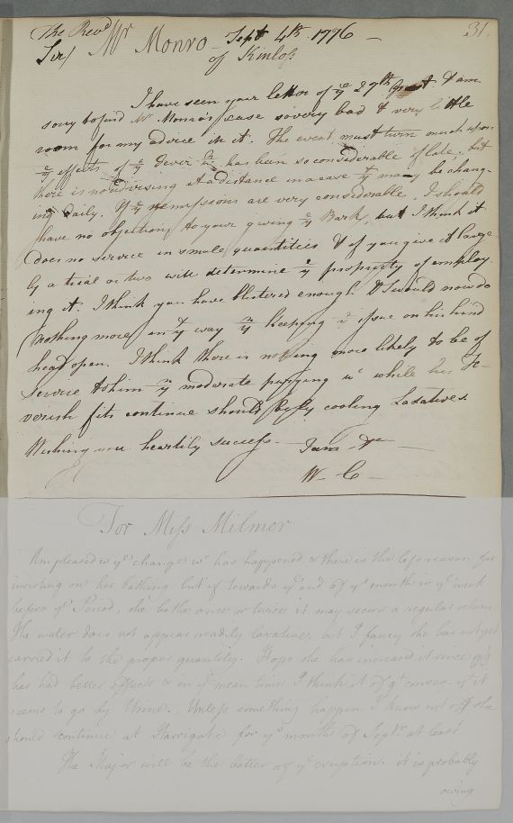 [ID:3919] From: Dr William Cullen (Professor Cullen) / To: Mr Roger Herriot / Regarding: Reverend James Munro (Monro, of Kinloss) (Patient) / 4 September 1776 / (Outgoing)