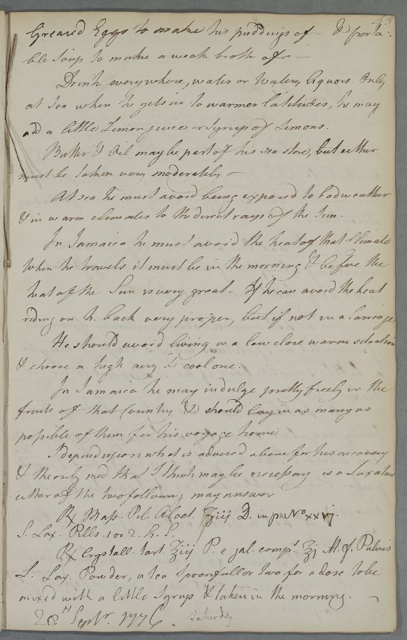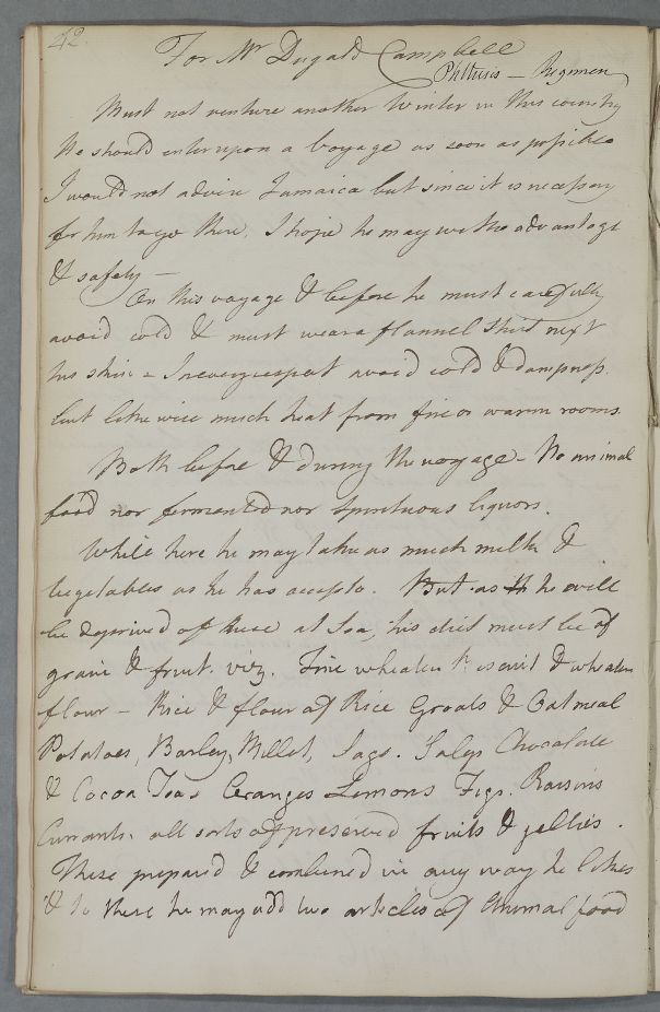 Reply, 'For Mr Dugald Campbell'. Mr Campbell 'Must not venture another Winter in this country'. Cullen does not advise Jamaica as a destination, but since he has to go there, he provides dietary advice for the voyage and (to some extent) living there. The only medicine needed is a laxative, for which he provides two recipes.