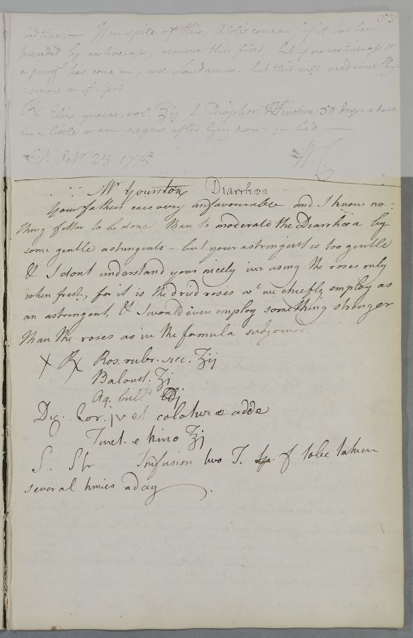 | Summary | Reply, for 'Mr [Peter] Yourston' the father of the addressee [who is Thomas Yorstoun]. Cullen thinks Thomas's astringents have been too mild, and that a stronger one is needed to stop the diarrhœa. He gives a recipe for a strengthening infusion. Position in casebook makes October 1776 date certain; date may be inferred to be 23 or 24 October. The abbreviation in the recipe leaves it ambiguous as to whether tea or tablespoonfuls are intended. |