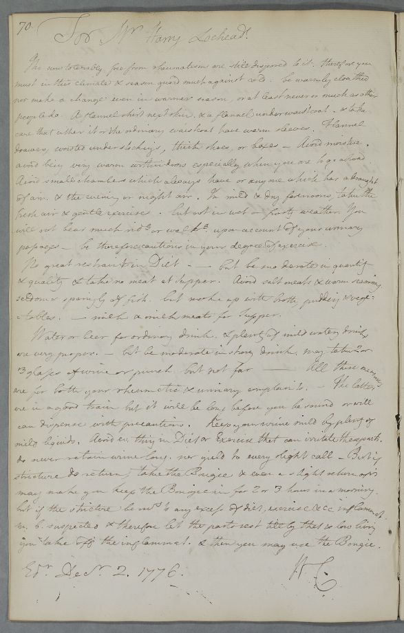 | Summary | Reply, 'For Mr Harry Lochead'. Cullen advises Mr Lochead on how to protect against rheumatism in the cold weather and his continued treatment for a urinary tract complaint. |