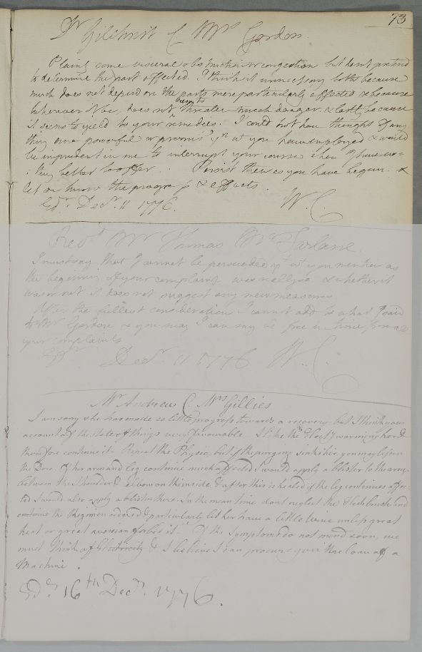 [ID:3965] From: Dr William Cullen (Professor Cullen) / To: Dr John Gilchrist (of Speddoch) / Regarding: Mrs Gordon (Patient) / 11 December 1776 / (Outgoing)