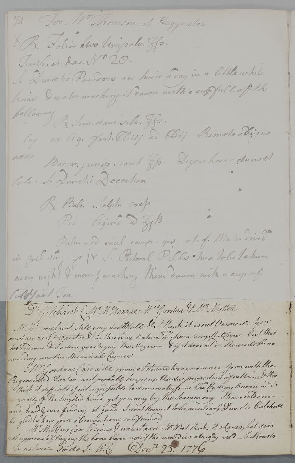 [ID:3969] From: Dr William Cullen (Professor Cullen) / To: Dr John Gilchrist (of Speddoch) / Regarding: Dr Thomas Mutter (Reverend) (Patient), Mr McKenzie (MacKenzie) (Patient), Mrs Gordon (Patient) / 23 December 1776 / (Outgoing)