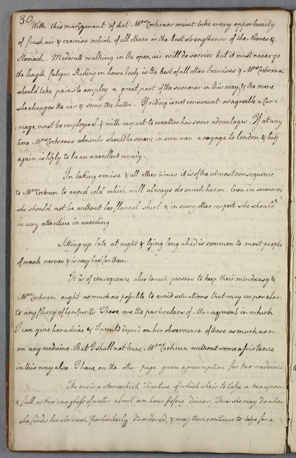 Reply 'For Mrs Cochran'. Much on diet and regimen with Stomachic medicines prescribed.