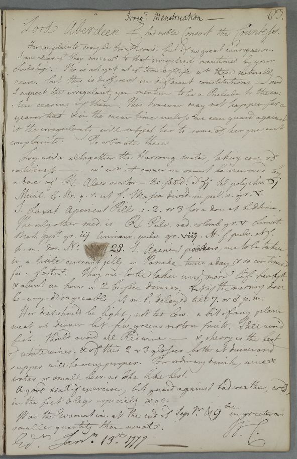 Reply, 'Lord Aberdeen C[oncerning] his noble Consort the Countess'. Includes two recipes to treat the Countess' irregular menstruation.