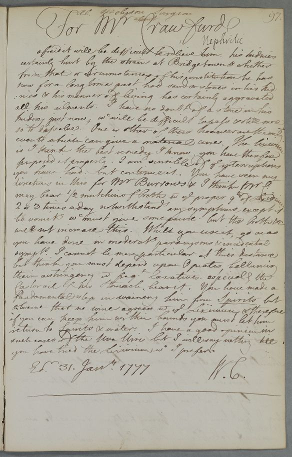 Reply to 'Al. Molyson Surgeon For Mr Crawfurd'. Advice to Alexander Mollison for treating Mr Crawfurd (one of Mollison's in-laws?), who has suffered a strain at Bridgeton, affecting his kidneys, and also has symptoms of a kidney stone. This needs to be passed or dissolved. Cullen refers him to his directions for 'Mr Burrows' (i.e. Mrs Burrow of Letter ID 380), and recommends the use of lixivium and opiates, with castor oil to temper costiveness.