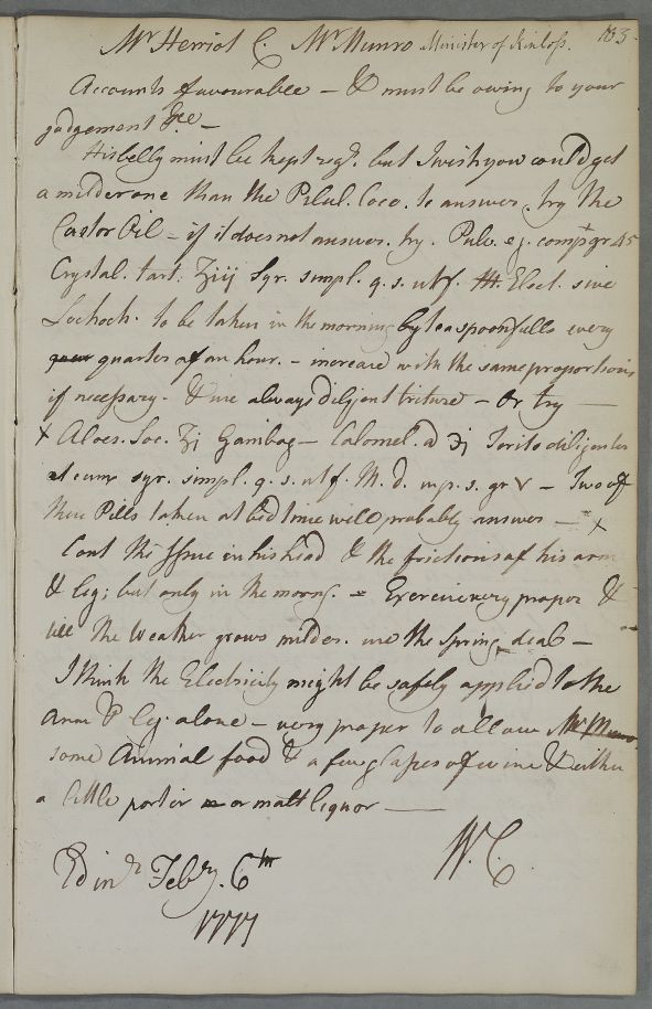 | Summary | Reply, 'Mr Herriot C[oncerning] Mr Munro. Cullen recommends medications, and continuation of friction on Rev. Munro's paralysed limbs and of the issue in his head. He also suggests using the 'Spring deal' for exercise and electricity on the arm and leg. |
