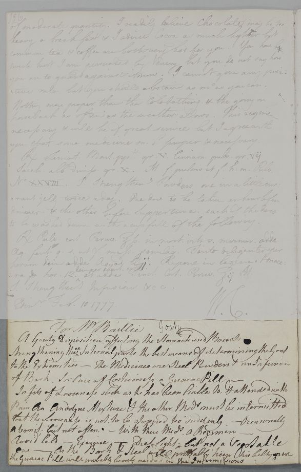 Reply 'For Mr Baillie'. In form of brief, rough notes for a regimen, with recipes for a 'Gouty Disposition affecting the Stomach and Bowels'. Cullen also refers back to recipes and advice supplied for Robert Ligertwood in Letter ID 3999.