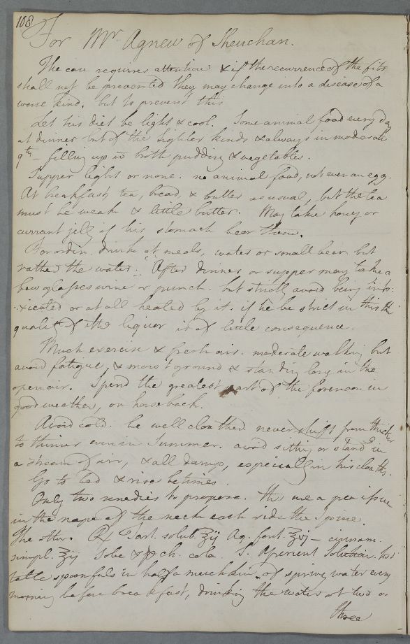| Summary | Reply 'For Mr Agnew of Sheuchan'. Cross-referencing identifies the addressee as Dr George Hamilton in Dumfries. Advice on diet and exercise and how to avoid fits. Cullen proposes a pea issue in the neck and an aperient solution as the only two remedies. |