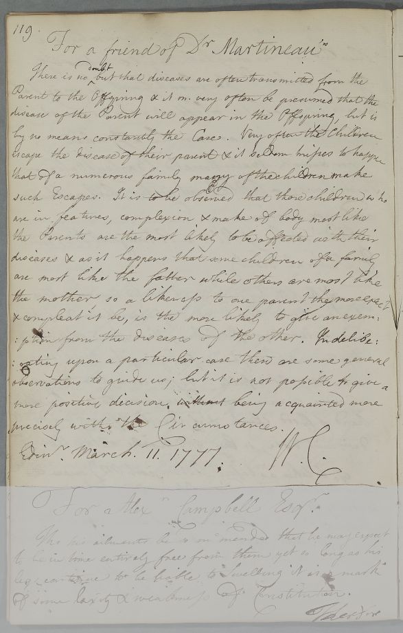 Reply 'For a friend of Dr Martineau's'. Cullen's response to Letter ID 1389, from Edinburgh medical student [Caleb Hillier] Parry, on the heritability of mental conditions.
