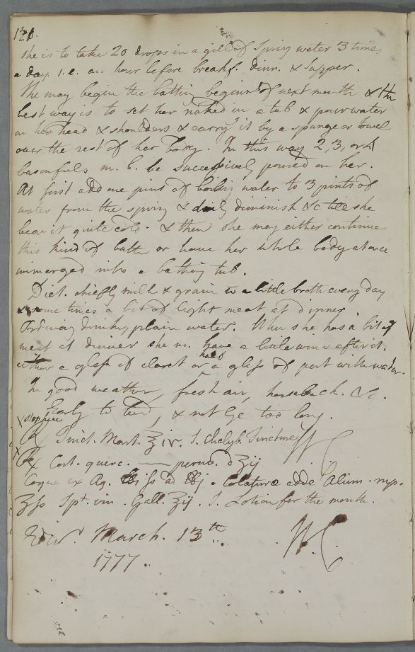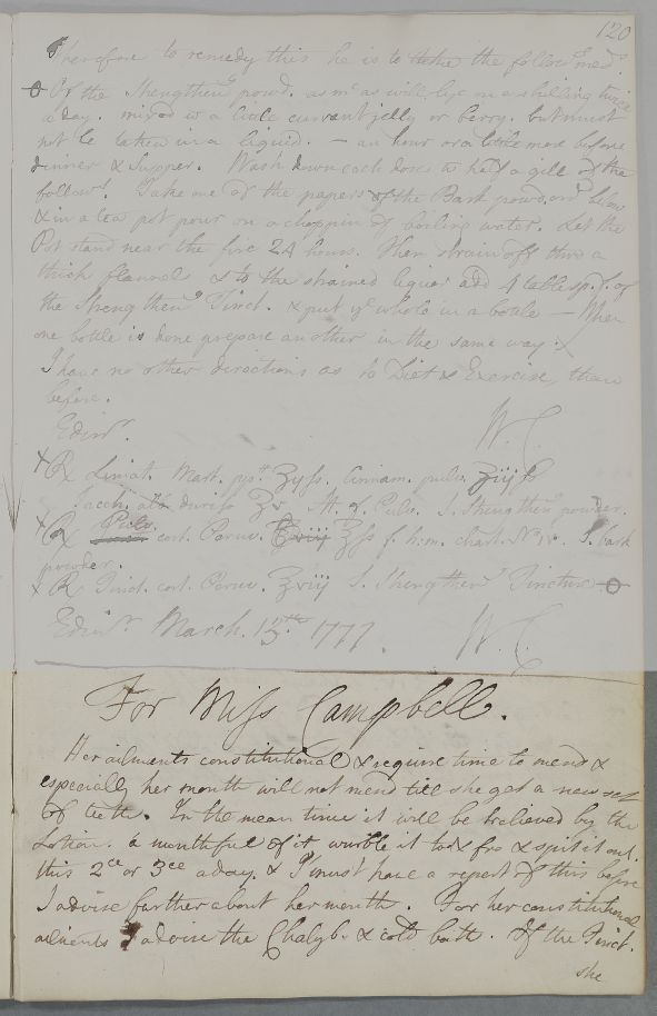 | Summary | Reply 'For Miss Campbell'. 'Her ailments constitutional & require time to mend & especially her mouth will not mend till she get a new set of teeth'. Cullen recommends chalybeate and cold water bathing, and gives a mouthwash recipe: 'a mouthful of it wurble it to & fro & spit it out'. |