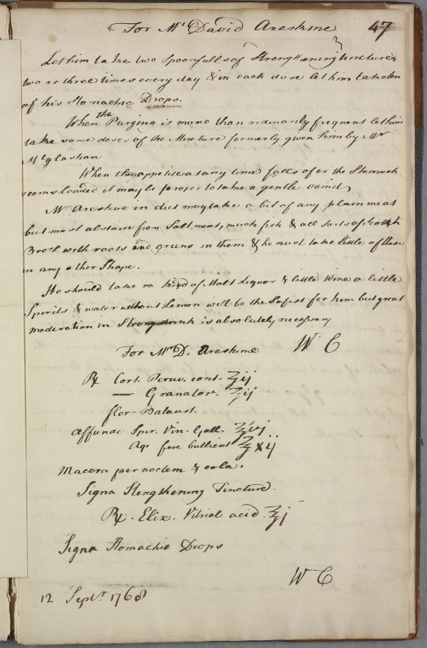 [ID:404] From: Dr William Cullen (Professor Cullen) / To: [ADDRESSEE UNKNOWN] / Regarding: Mr David Areskine (Patient) / 12 September 1768 / (Outgoing)