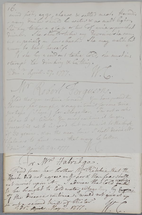 [ID:4048] From: Dr William Cullen (Professor Cullen) / To: [ADDRESSEE UNKNOWN] / Regarding: Mrs Hatridge (Ritchie) (Patient) / 2 May 1777 / (Outgoing)