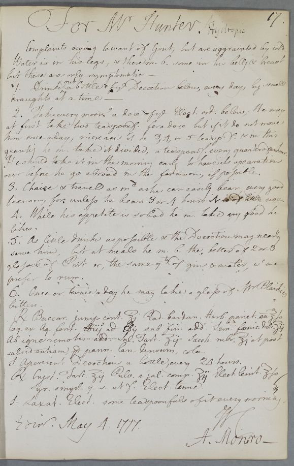 | Summary | Reply 'For Mr Hunter', signed by Cullen and Monro. Advice and recipes, possibly to Mr Lawder [Lauder], for John Hunter of Crooks, near Coldstream, who has symptoms of dropsy, which are ascribed to 'want of Gout'. |