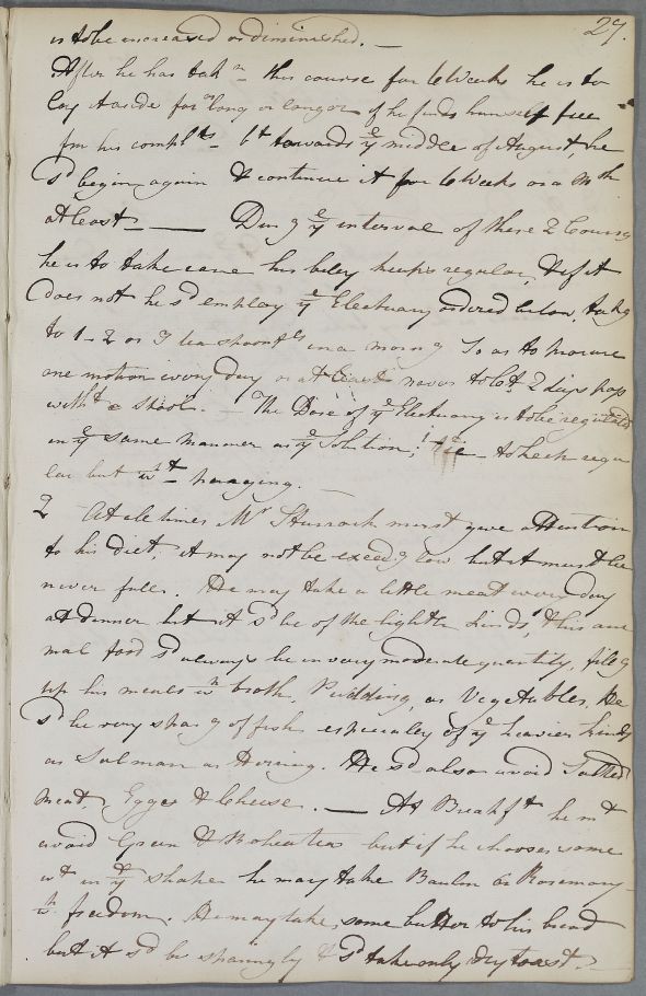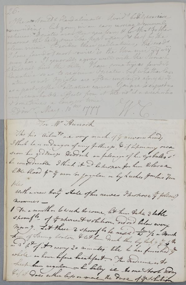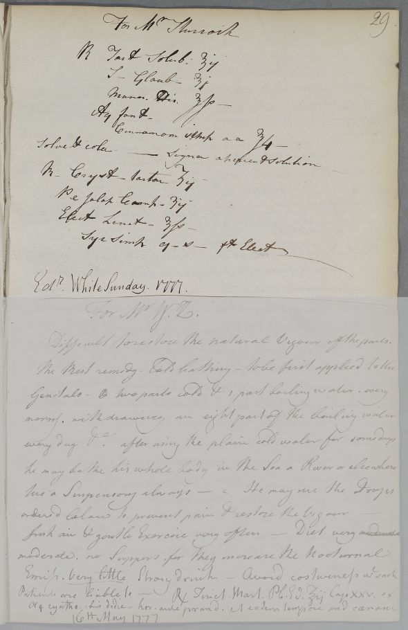 | Summary | Reply 'For Mr Sturrock'. 'WhiteSunday' or Whitsunday 1777 fell on the 15th May (which also accords with position in the casebook). This regimen may have been handed to Sturrock in person because in writing to Cullen on the 21st May he implies that the had recently seen the physician in Edinburgh. |