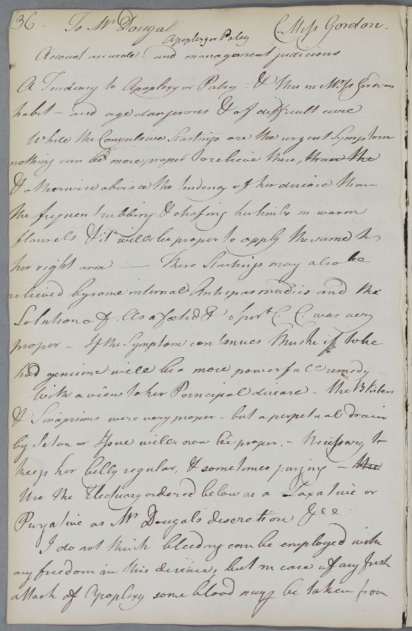 Case of Miss Gordon under the care of Mr Dougal for a palsy and apoplexy. One of several letters and entries concerning a "Miss Gordon" who cannot be postively identified as being the same patient across several cases. |