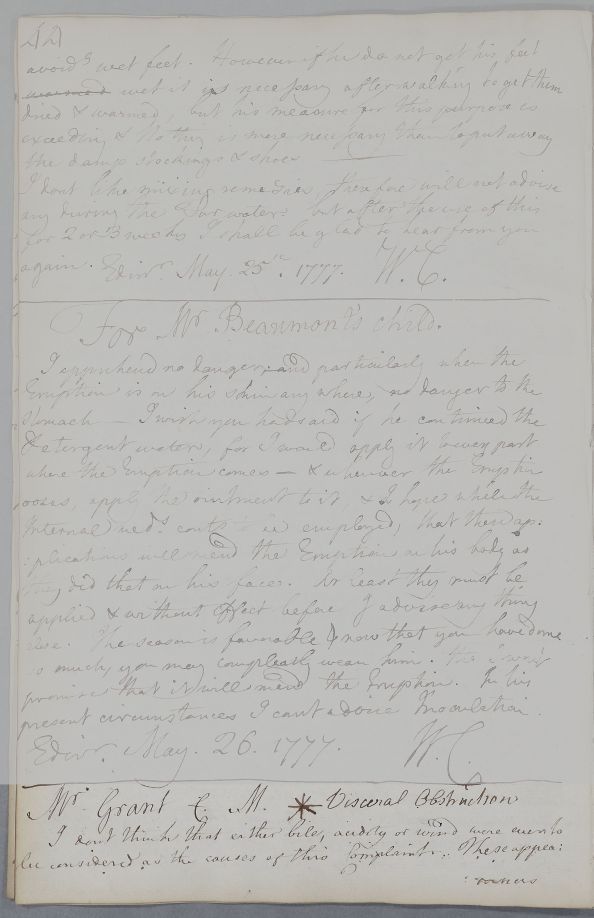 [ID:4074] From: Dr William Cullen (Professor Cullen) / To: Mr Alexander Grant (in Forres) / Regarding: (M(rs)? or M(iss)?) (Patient) / 31 May 1777 / (Outgoing)