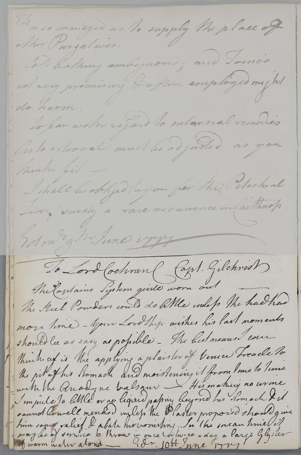 [ID:4080] From: Dr William Cullen (Professor Cullen) / To: Earl Archibald Cochrane (9th Earl of Dundonald; Lord Dundonald) / Regarding: Captain James Gilchrist (of Annsfield) (Patient) / 10 June 1777 / (Outgoing)