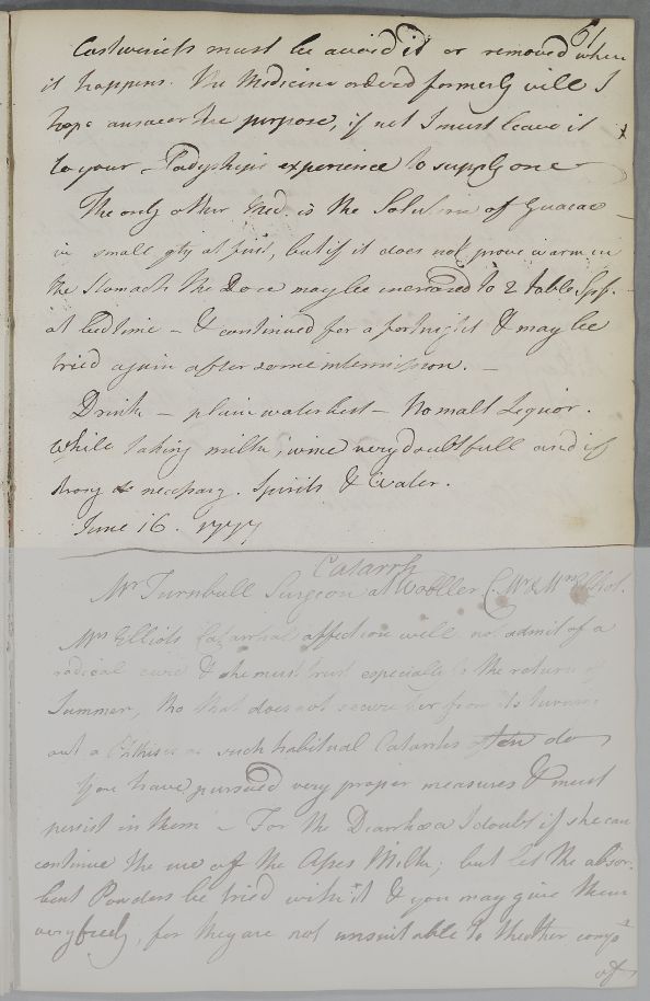 [ID:4085] From: Dr William Cullen (Professor Cullen) / To: Dr / Regarding: Countess Jane Cochrane (Stuart) (of Dundonald; Lady Dundonald) (Patient) / 16 June 1777 / (Outgoing)