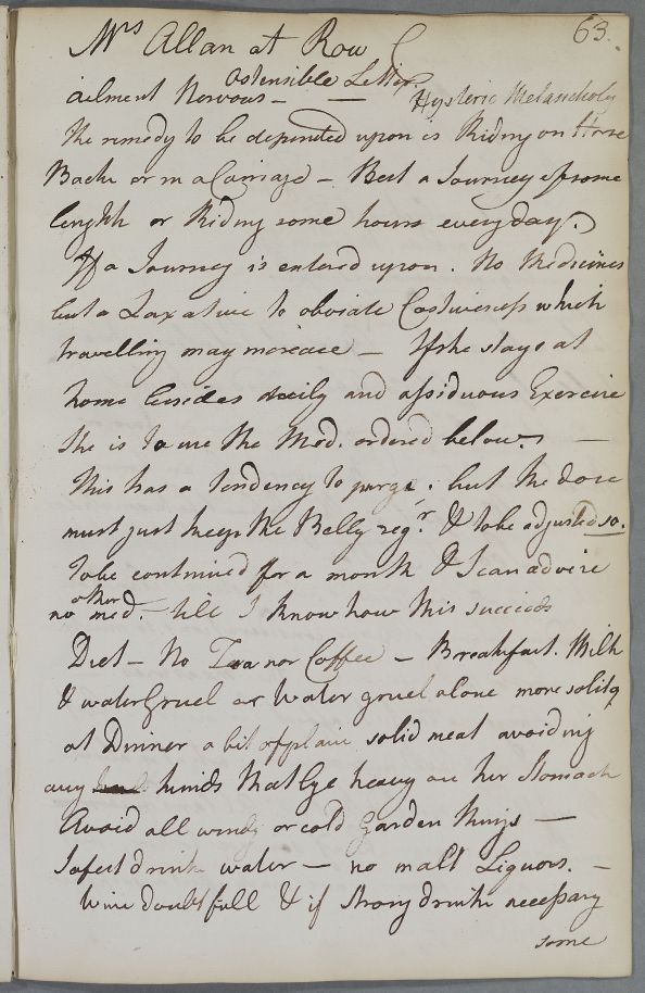 Case of Mrs Allan, the wife of the minister at Row, who is diagnosed as being an 'hysterical melancholic' arising from religious considerations' but whose condition improves with a regimen and medicines. |