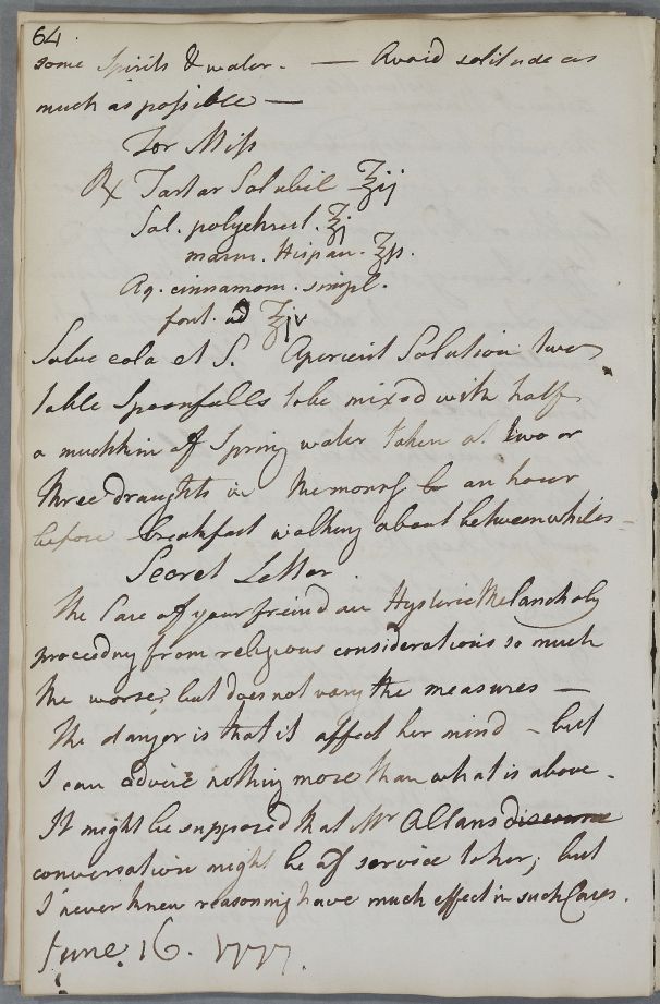 | Summary | Reply, 'Mrs Row C.'; a subtitle reads 'Ostensible Letter', with a 'Secret Letter' added below, diagnosing her with 'Hysteric Melancholy proceeding from religious considerations'. |