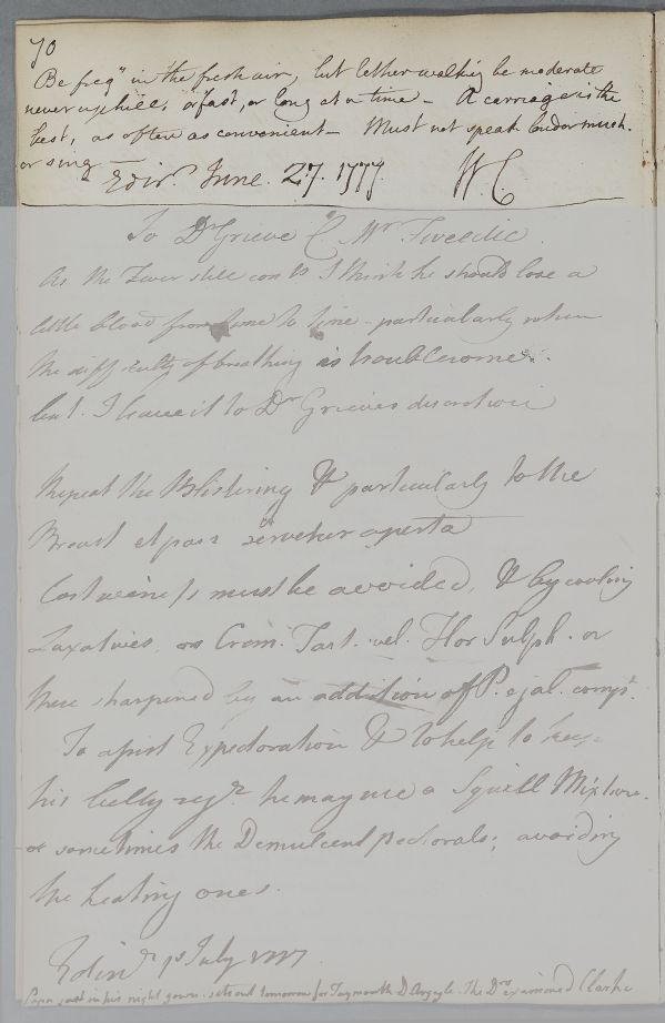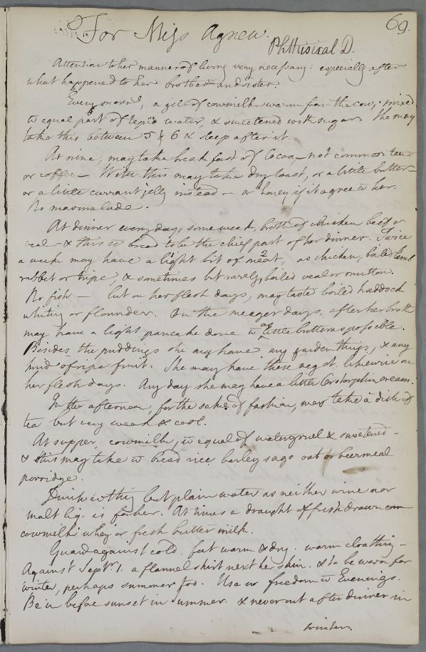 Reply 'For Miss Agnew'. Diet and lifestyle advice for Miss Agnew (of Lochnaw), who has already lost siblings to consumption.