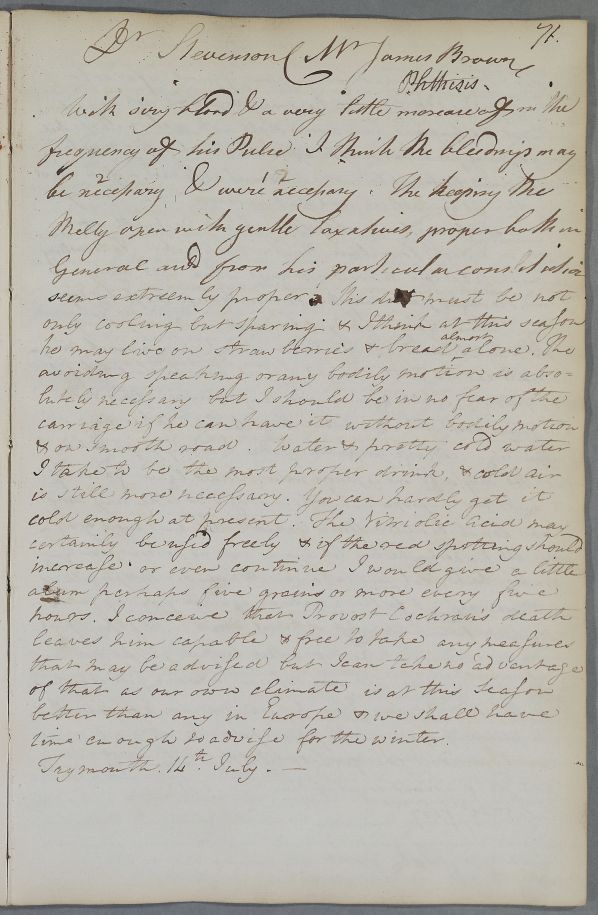 [ID:4095] From: Dr William Cullen (Professor Cullen) / To: Dr Alexander Stevenson (Professor; of Dalgairn ) / Regarding: Mr James Brown (Browne, Broune) (of Kilmarnock) (Patient) / 14 July 1777? / (Outgoing)