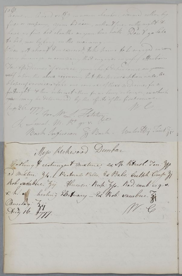 [ID:4118] From: Dr William Cullen (Professor Cullen) / To: Miss Kirkwood Dunbar / Regarding: Miss Kirkwood Dunbar (Patient) / 16 August 1777 / (Outgoing)