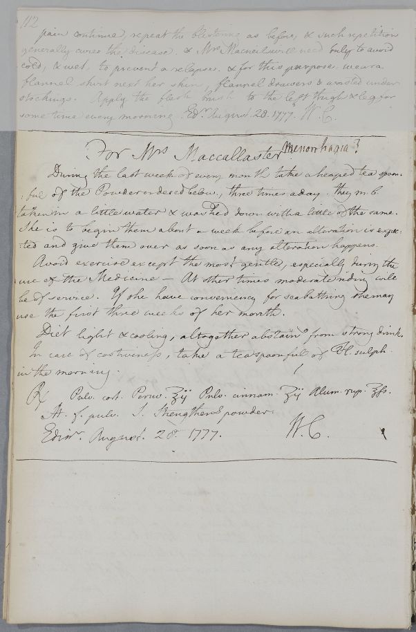 [ID:4123] From: Dr William Cullen (Professor Cullen) / To: [ADDRESSEE UNKNOWN] / Regarding: Mrs Maccallaster (Patient) / 28 August 1777 / (Outgoing)
