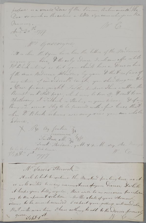 [ID:4127] From: Dr William Cullen (Professor Cullen) / To: Mr James Sturrock / Regarding: Mr James Sturrock (Patient) / 1 September 1777? / (Outgoing)