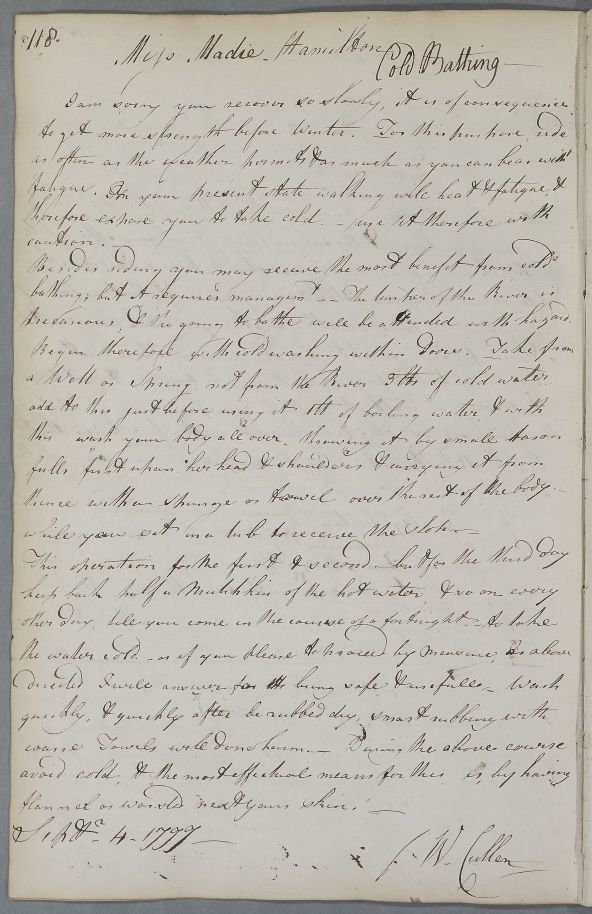 [ID:4128] From: Dr William Cullen (Professor Cullen) / To: Miss Madie Hamilton / Regarding: Miss Madie Hamilton (Patient) / 4 September 1777 / (Outgoing)