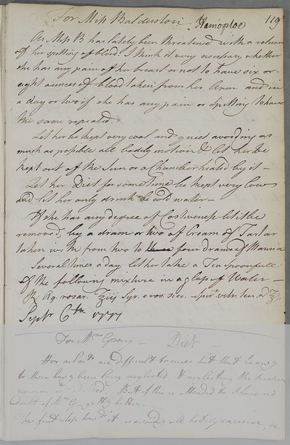 [ID:4129] From: Dr William Cullen (Professor Cullen) / To: Miss Balderston / Regarding: Miss Balderston (Patient) / 6 September 1777 / (Outgoing)