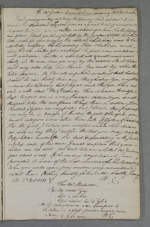[ID:4157] From: Dr William Cullen (Professor Cullen) / To: Dr David Goodsir / Regarding: Mr William Henderson (Patient) / 2 October 1777 / (Outgoing)