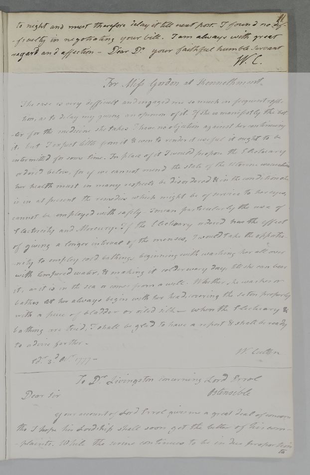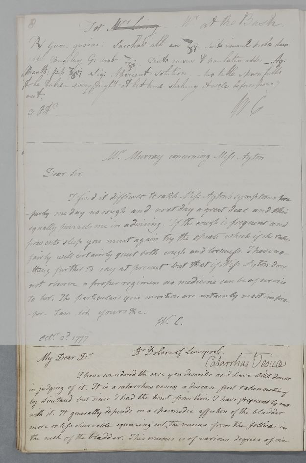 [ID:4160] From: Dr William Cullen (Professor Cullen) / To: Dr Matthew Dobson / Regarding: Mr (Patient), Anonymous (Patient), Anonymous (Patient), Anonymous (Patient) / October? 1777? / (Outgoing)