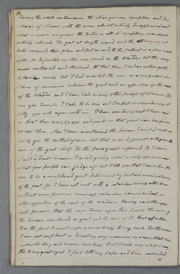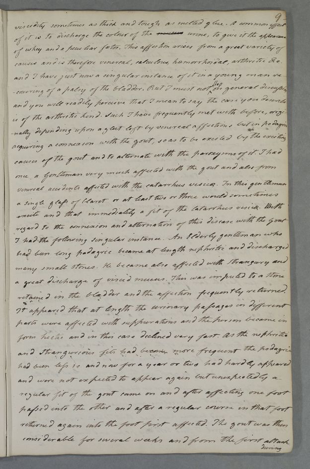 Case of 'An Elderly gentleman who has been long podagric' who 'became at length nephritic and discharged many small stones. He became also affected with Stranguary and a great discharge of viscid mucus'. |