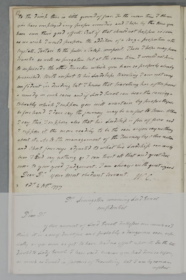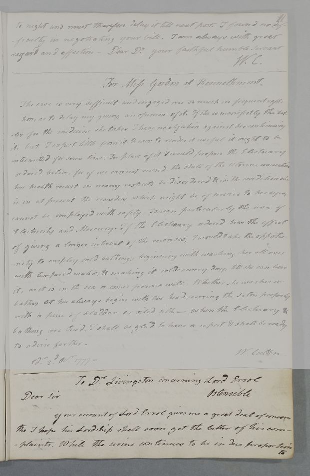 [ID:4162] From: Dr William Cullen (Professor Cullen) / To: Dr Thomas Livingston / Regarding: Earl James Boyd Hay (15th Earl of Erroll, Lord Erroll, Lord Errol) (Patient) / 4 October 1777 / (Outgoing)