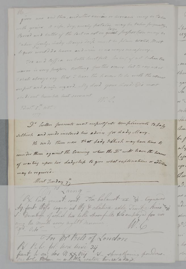 [ID:4165] From: Dr William Cullen (Professor Cullen) / To: Lady Helen Douglas (Hamilton) (Lady Selkirk) / Regarding: Lady Mary Douglas (Patient) / 7 October? 1777? / (Outgoing)