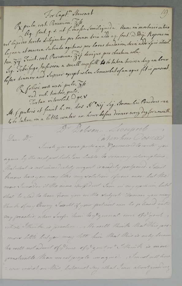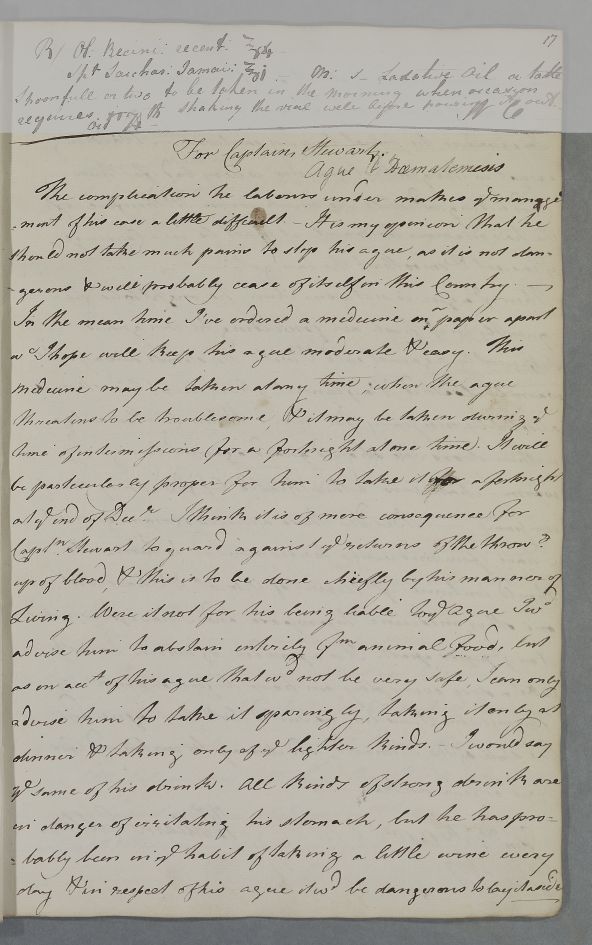 | Summary | Reply 'For Captain Stewart', whose case is complicated by an ague. No incoming letter traced. Addressee unidentified. Addressee unidentified but likely Robert Wood (ID: 101) judging from other documents in the case. |