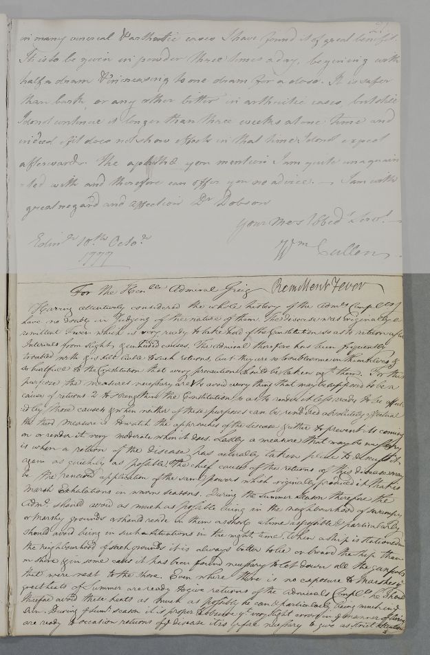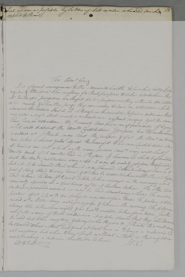 [ID:4170] From: Dr William Cullen (Professor Cullen) / To: [ADDRESSEE UNKNOWN] / Regarding: Admiral Samuel Greig (Admiral Greig; Samuil Karlovich Greig) (Patient) / 8? October 1777 / (Outgoing)