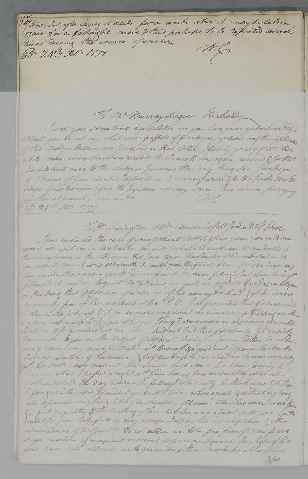 [ID:4176] From: Dr William Cullen (Professor Cullen) / To: Dr Thomas Livingston / Regarding: Mrs Gordon (Craigmil?) (Patient) / 24 October 1777 / (Outgoing)