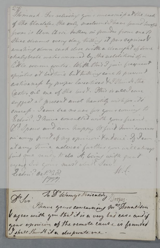 Reply 'To Dr Wemys Kircaldy'. Concerning Mrs Donaldson's case. Cullen believes her case of dropsy to be a desperate one: 'However I think no patient is to be deserted'. He suggests alkalines as diuretic treatment, a blister and possibly puncturing the legs if necessary.