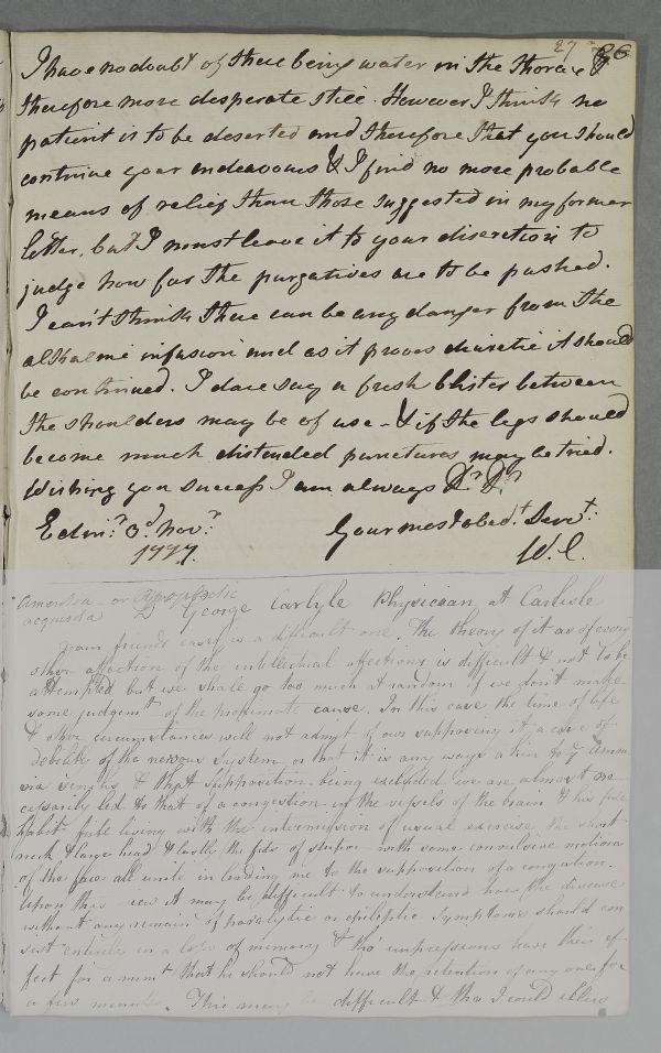 | Summary | Reply 'To Dr Wemys Kircaldy'. Concerning Mrs Donaldson's case. Cullen believes her case of dropsy to be a desperate one: 'However I think no patient is to be deserted'. He suggests alkalines as diuretic treatment, a blister and possibly puncturing the legs if necessary. |