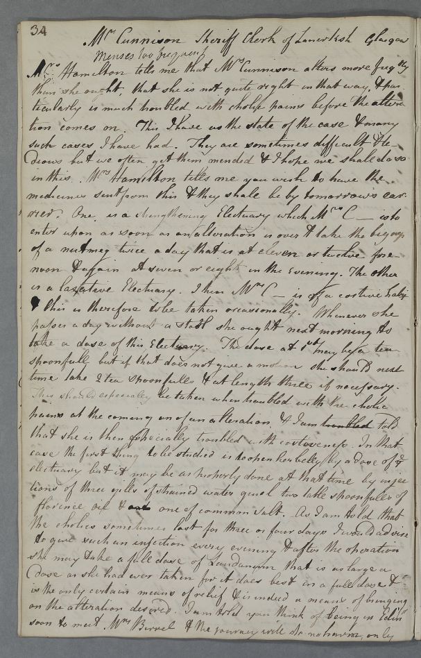 | Summary | Reply, 'Mr Cunnison Sherrif Clerk of [Lanarkshire] Glasgow', concerning the case of Mrs Cunnison who has menstrual pain and colic. |