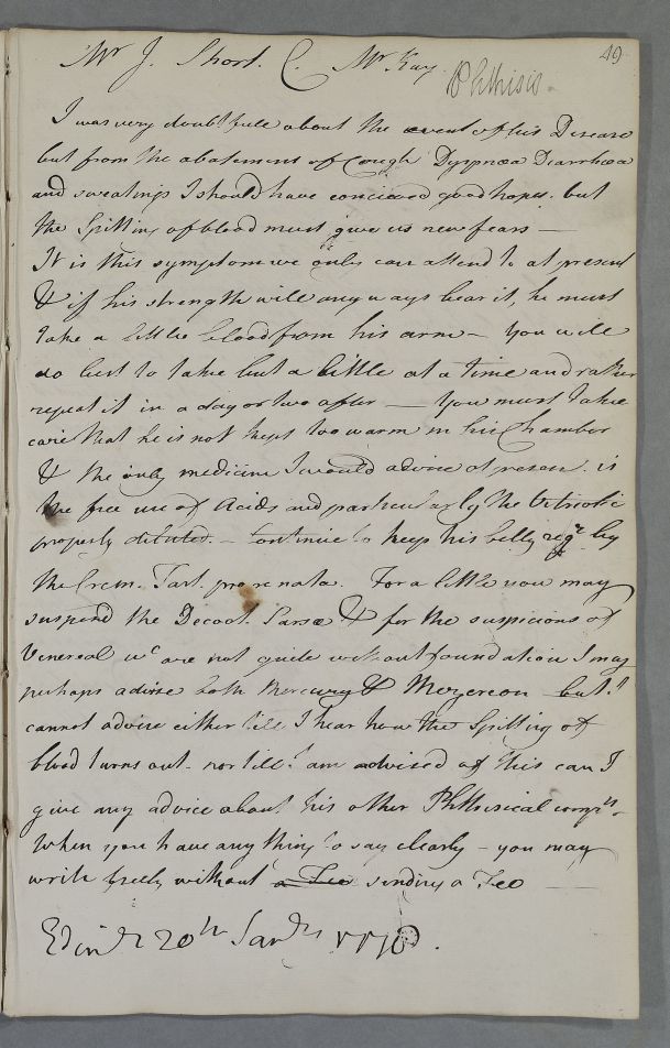 | Summary | reply headed 'Mr J. Short C[concerning] Mr Kay' in which Cullen insists that his spitting of blood is the main symptom to address. |