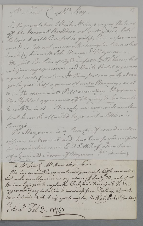| Summary | Reply headed 'To Mr Ker C. Mr Kennedys Son' in which Cullen does not think the changed circumstance prompt him to alter the advice he gave on 28 January on the use of Chalybeate Powders. |