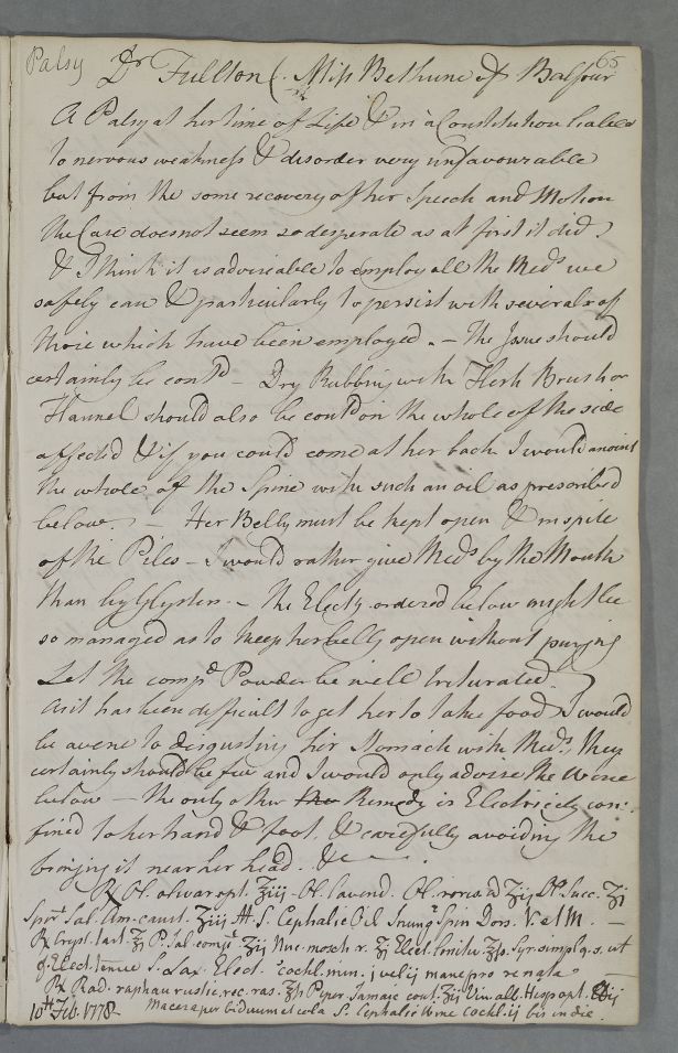 [ID:4215] From: Dr William Cullen (Professor Cullen) / To: Dr John Fulton (Fullton) / Regarding: Miss Alice Bethune (of Balfour) (Patient) / 10 February 1778 / (Outgoing)