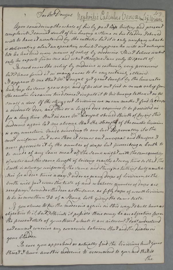 Case of Alexander Dougall, a surgeon, with a history of gout and kidney stones but who now has a very painful bladder condition which is suspected of being a stone. |