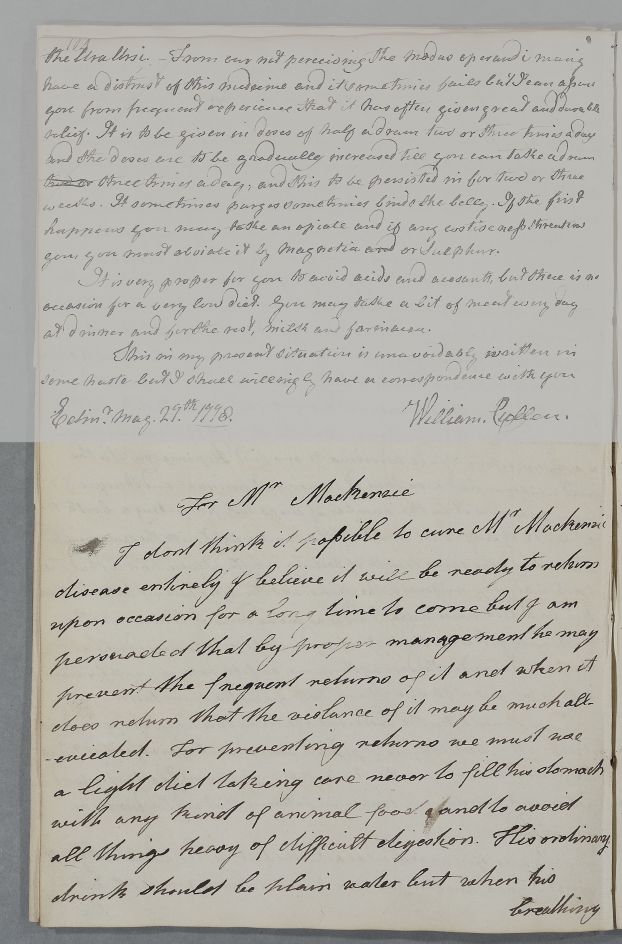 [ID:4247] From: Dr William Cullen (Professor Cullen) / To: Anonymous / Regarding: Mr MacKenzie (Patient) / 29? May? 1778? / (Outgoing)
